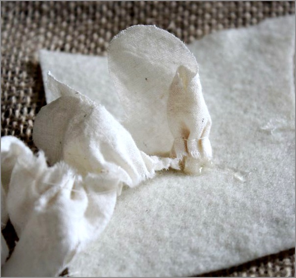 12. Com pistola de cola à mão, adicione uma bola de cola para o pau e enrole o tecido em volta do pau. Envolver o tecido 1 a 1,5 vezes em torno.