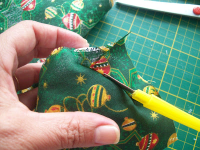 Com o desfazedor de besteiras ..rsrsr...encaixe o tecido nos cortes que fez...