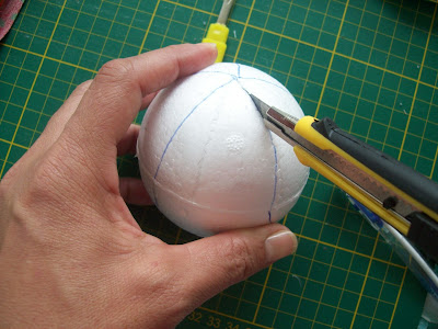 não corte a bola toda, somente o suficiente para encaixar o tecido depois.