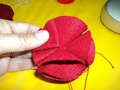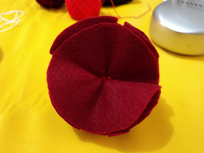 Para fazer a pétala, pegue um circulo maior dobre o circulo maior no meio e depois dobre no meio novamente, e pregue a primeira pétala em um dos círculos maiores.