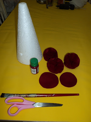 * Bolas de natal * 1 cone de isopor * Cola quente * Tesoura * Corrente de bolinhas / contas de Natal |
