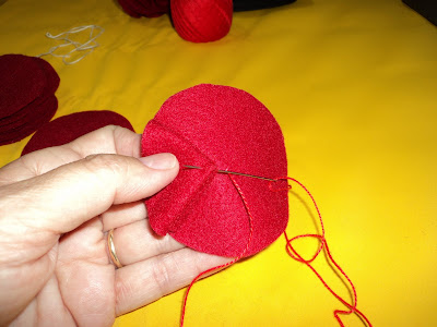 Vá colando as flores com cola quente. E não se preocupe elas não ficam intercaladas, sobrara espaços entre elas.